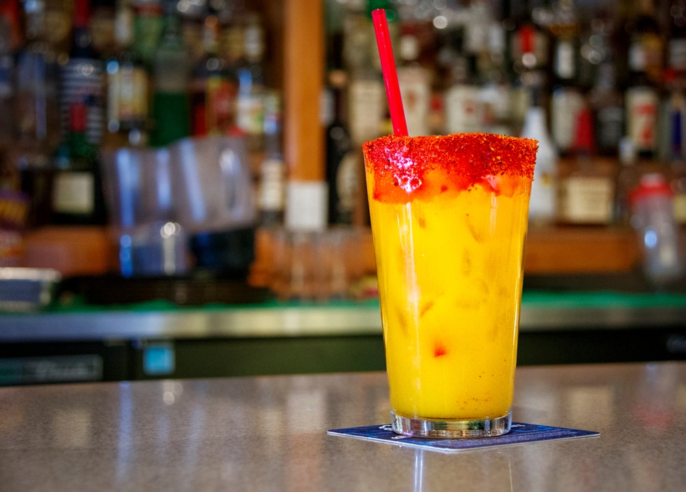 Beer, clamato, lime, house hot sauce blend, jumbo shrimp, cucumber, chamoy + Tajín rim. A meal in a glass.